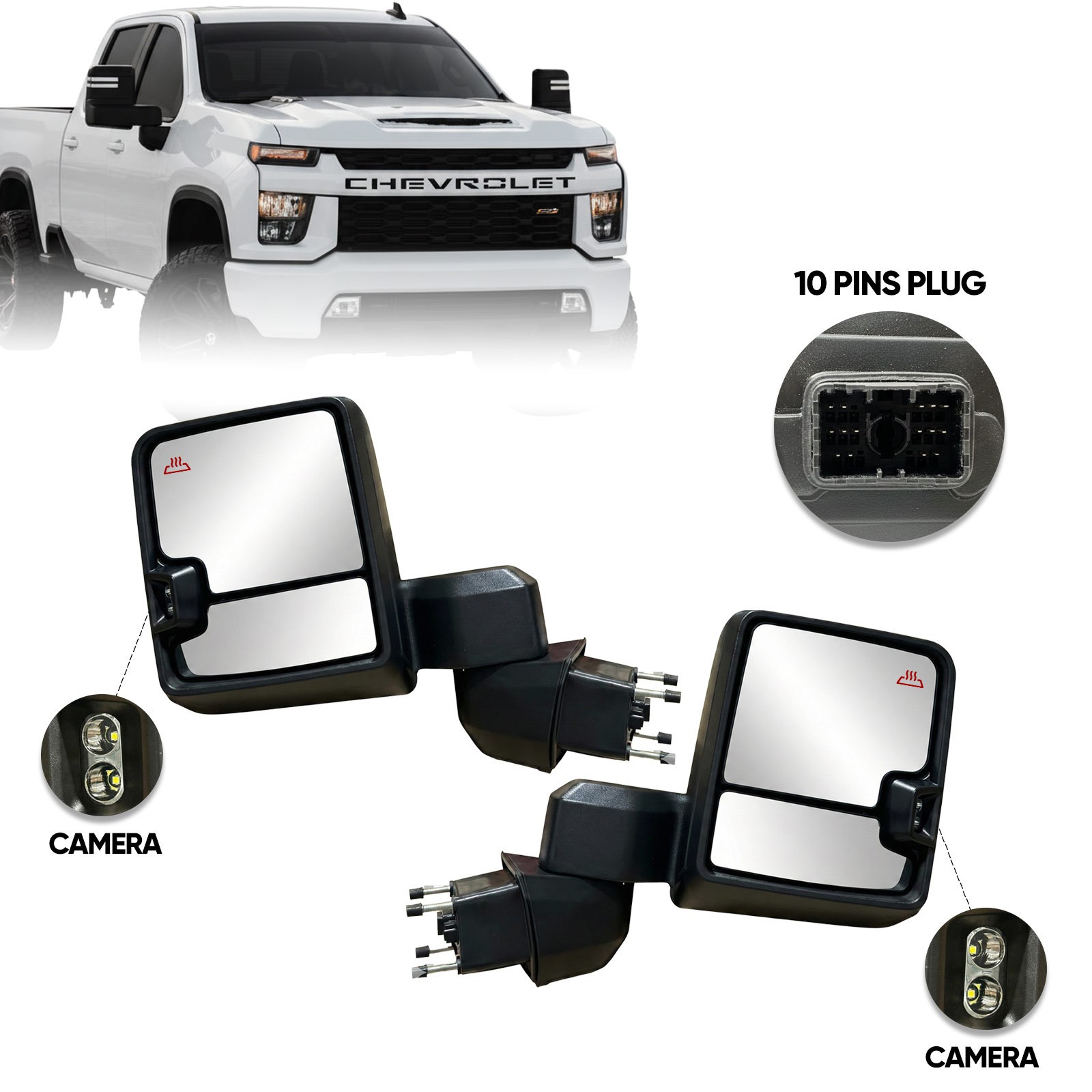 BLACK TOW MIRROR WITH CAMERA AND 10 PINS PLUGSPlacement of Vehicle: Right Passenger and Left Driver SideItem is Brand NewFeatures:HeatedBlind Spot MonitoringManual Folding